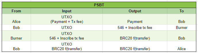 Bob create the Psbt and Burner account, and signed. Then ship to Alice to make cost and signal.